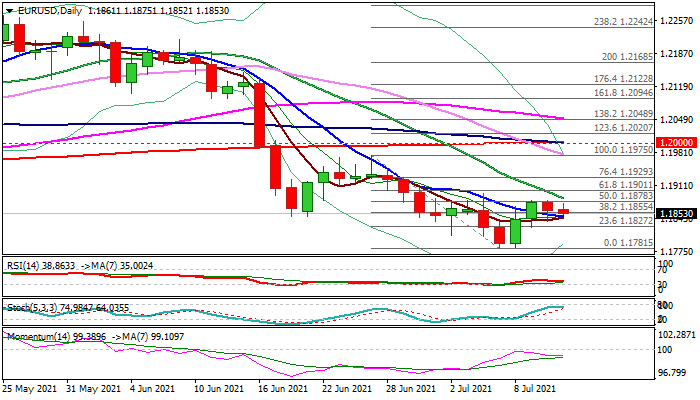 Near-term action generated initial positive signal on break and repeated close above 10DMA (1.1848), but confirmation of signal requires lift and close above 20DMA (1.1885) and Fibo 61.8% of 1.1975/1.1781 (1.1901).