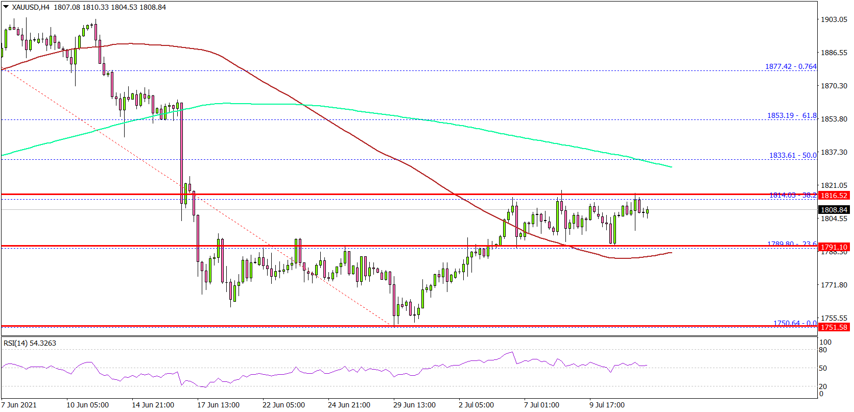 There was also a close above $1,800 and the 100 simple moving average (red, 4-hours). However, the price is struggling to gain pace above $1,815 and $1,820. The next key resistance is near $1,835 and the 200 simple moving average (green, 4-hours).