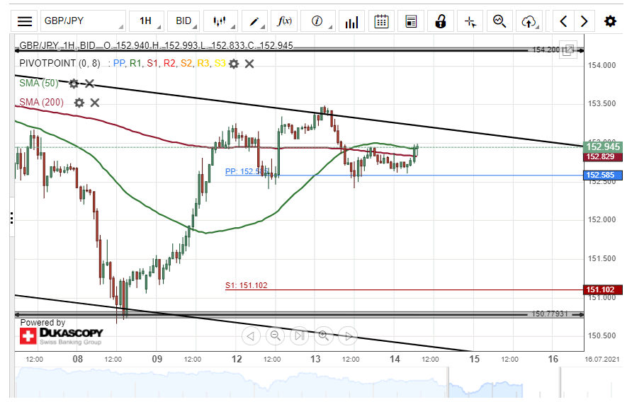 However, given that the currency exchange rate is currently trading near the upper boundary of the channel pattern at 152.82, a breakout could occur within the following trading session.