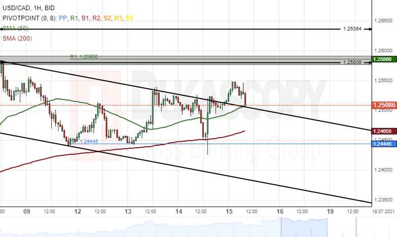 The USD/CAD currency pair bounced off a support level formed by the 200– hour simple moving average at 1.2450 on Wednesday. As a result, the US Dollar surged by 98 pips or 0.78% against the Canadian Dollar. A breakout occurred through the upper boundary of a descending channel pattern during yesterday’s trading session.