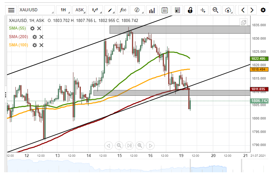The yellow metal’s price fell by 215 points or 1.17% during Friday’s trading session. The decline was stopped by the 200– hour simple moving average at 1811.00 on Friday.