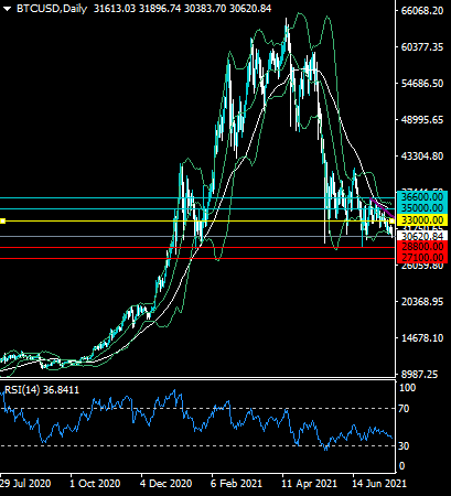 Alternatively, the BTCUSD pair may hold above the lower Bollinger Band on the daily time frame, and then start to attract buying interest. BTCUSD may then rebound towards the $33,000 resistance lower.