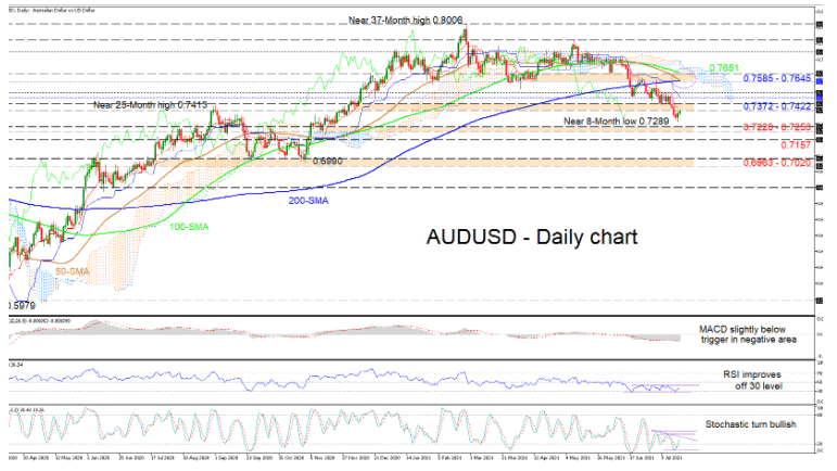 AUDUSD is striving to extend above the curbing boundary of 0.7372-0.7422 after buyers re-emerged around a near 8-month low of 0.7289. The short-term picture suggests that sellers have gained the upper hand, which could be further confirmed by the completion of forthcoming bearish crossovers of the 200-day simple moving average (SMA) by the diving 50- and 100-day SMAs.