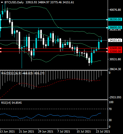 The BTCUSD pair is trading towards the upper daily Bollinger Band, around the $35,250 level. A break above the upper Bolling Band would be hugely bullish.