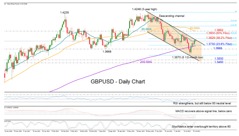 GBPUSD extended its recovery from a 5 ½-month low of 1.3570 marginally above the 1.3800 level and the 20-day simple moving average (SMA) on Monday but another obstacle has emerged.