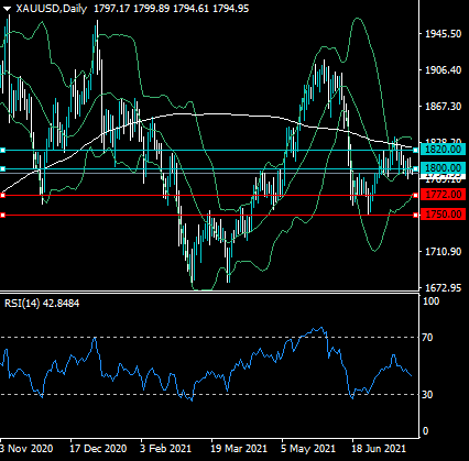 XAUSUD is vulnerable towards the lower Daily Bollinger Band, around the $1,772 support level, after slipping below the mid-line of the Bollinger Band indicator.