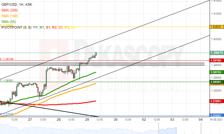 The GBP/USD currency exchange rate has passed the resistance of the 1.3900 marks and the weekly R2 simple pivot point at 1.3919. The next target for the rate appears to be the 1.4000 level.