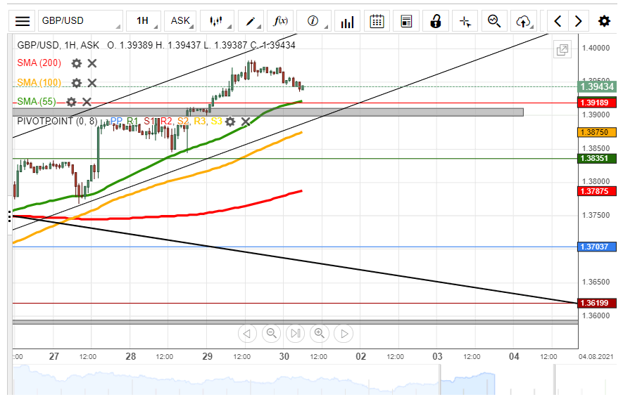 The currency exchange rate could find support in the 55-hour simple moving average near 1.3920 and the weekly R2 simple pivot point at 1.3919. In addition, support could be provided by the previous July high zone above the 1.3900 mark.