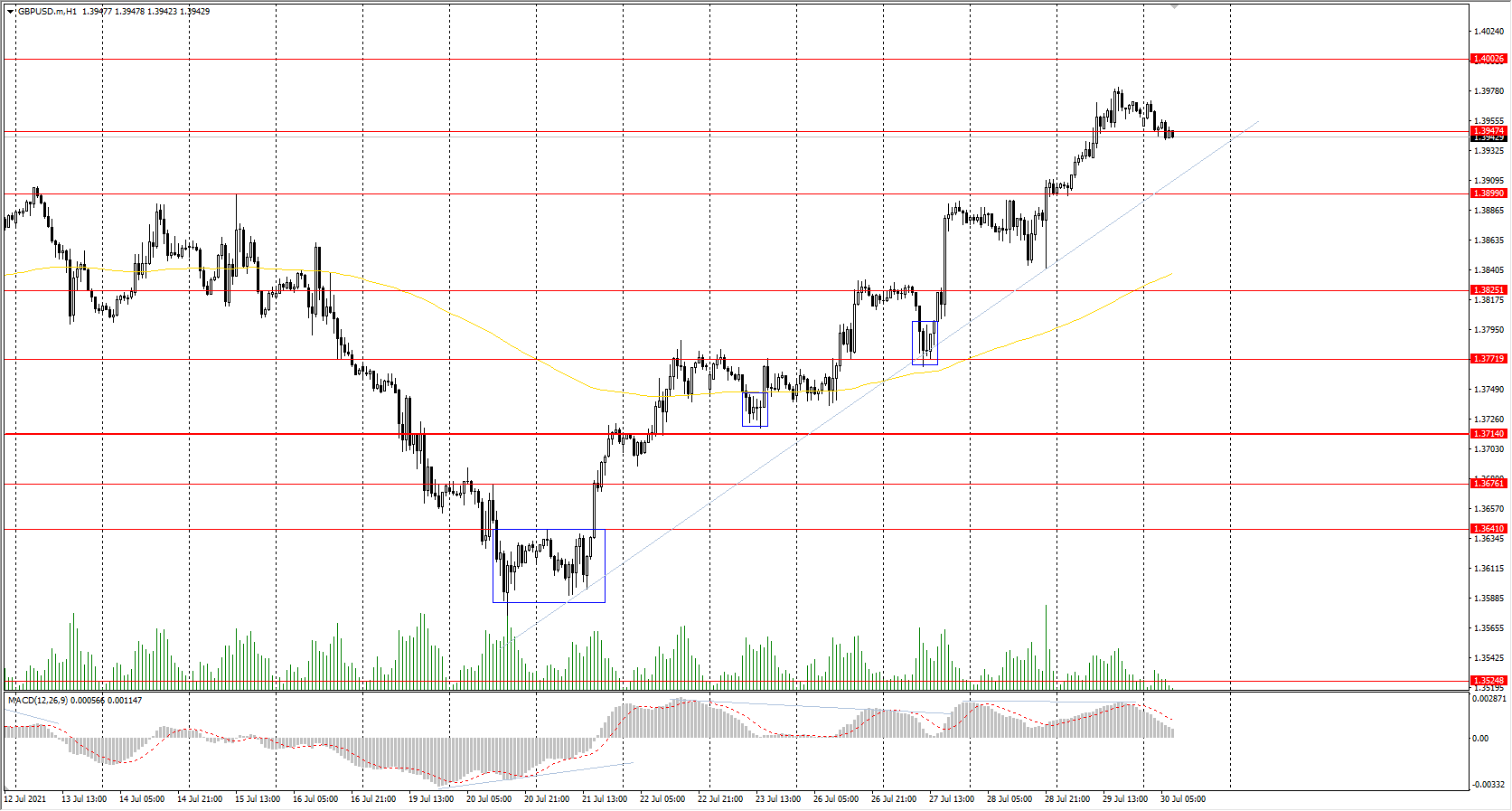 The GBP/USD currency pair trend is bullish on the H1 timeframe. The MACD indicator is in the positive zone but with signs of divergence. Under such market conditions, traders are better to look for buy positions after the price pulls back to the support level. There are no optimal points for sell positions right now. Traders can search for intraday sell entries from the resistance level with short targets, but they should understand that it will be trading against the main trend.
