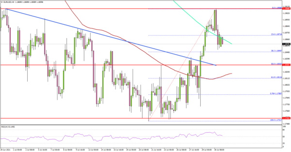 The pair even broke the 1.1900 level and the 200 simple moving average (green, 4-hours). A high was formed near 1.1908 before the pair corrected lower.