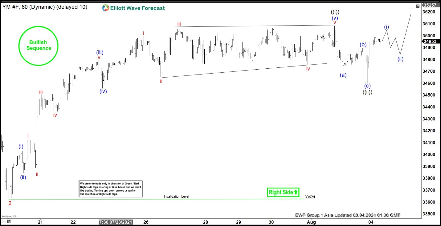 Short Term Elliott Wave view in Dow Futures (YM) suggests the rally from June 21 low is unfolding as a 5 waves impulse Elliott Wave structure. Up from June 21 low, wave 1 ended at 34975 and pullback in wave 2 ended at 33624. Index has resumed higher in wave 3 with internal subdivision as another 5 waves impulse in lesser degree. Up from wave 2, wave (i) ended at 34034 and pullback in wave (ii) ended at 33843. Index resumes higher again in wave (iii) towards 34789 and dips in wave (iv) ended at 34557. Final leg higher wave (v) of ((i)) ended at 35082.