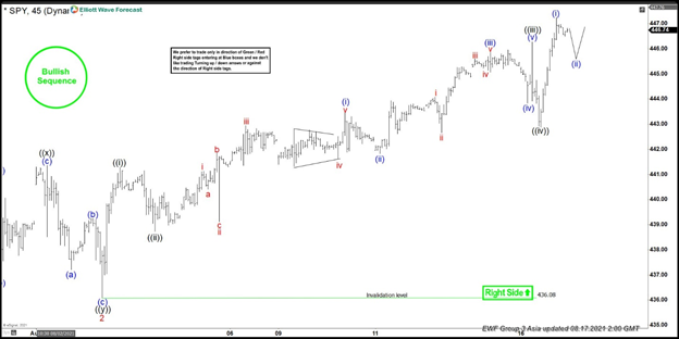 Short-term Elliott wave view in SPY suggests that the cycle from 19 July 2021 low is unfolding in an impulse sequence favoring more upside extension to happen. Up from that low, the index has ended the first leg in wave 1 at 441.16 high. Then wave 2 pullback unfolded as a double three structure where wave ((w)) ended at 436.86 low. Wave ((x)) bounce ended at 441.37 high and wave ((y)) ended at 436.08low, thus completed the wave 2 pullback.