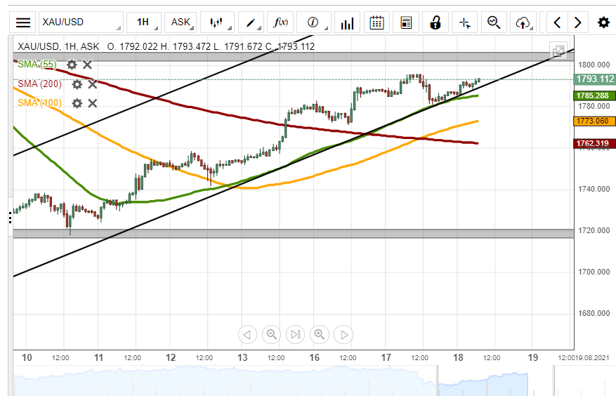 The yellow metal’s price decreased by 134 pips or 0.75% on Tuesday. The decline was stopped by the 55– hour simple moving average at 1784.1 during Tuesday’s trading session.