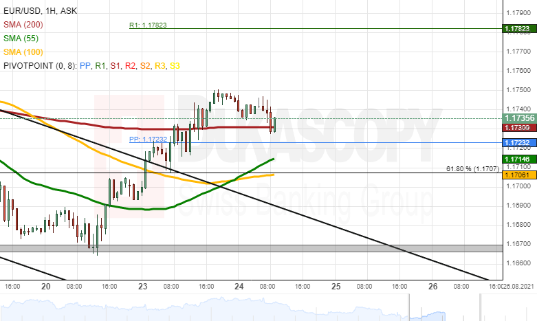 The surge of the EUR/USD managed to pass the resistance of the weekly simple pivot point at 1.1723 and the 200-hour simple moving average near 1.1730. Moreover, the rate reached the 1.1750 level before slightly declining on Tuesday morning.
