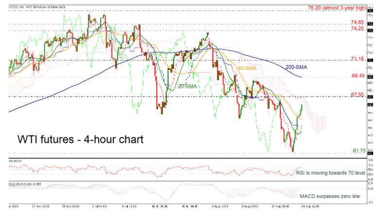 WTI crude oil futures have been in a strong positive movement over the last 4-hour sessions, following the turning point at the 61.75 support level. The price jumped above the short-term SMAs and is moving towards the Ichimoku cloud. The RSI is approaching the overbought territory, while the MACD is holding above its trigger and zero lines.