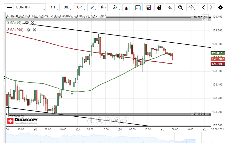 The EUR/USD currency pair bounced off a support level formed by the 50– and 200– hour SMAs at 128.66 on Tuesday. As a result, the common European currency surged by 31 pips or 0.24% against the Japanese Yen during Tuesday’s trading session.