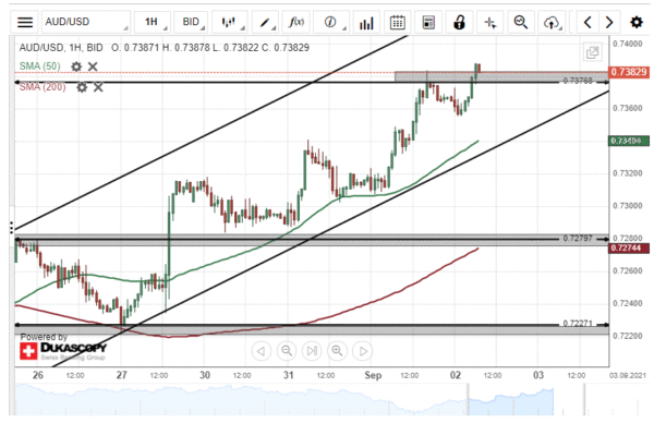 On Wednesday, the AUD/USD currency pair bounced off a support level formed by the 50– hour simple moving average at 0.7311. As a result, the Australian Dollar surged by 65 pips or 0.89% against the US Dollar during yesterday’s trading session.