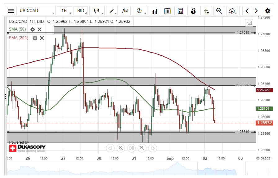 On Wednesday, the US Dollar surged by 53 pips or 0.43% against the Canadian Dollar. The surge was stopped by the 200– hour simple moving average at 1.2635 during Wednesday’s trading session.