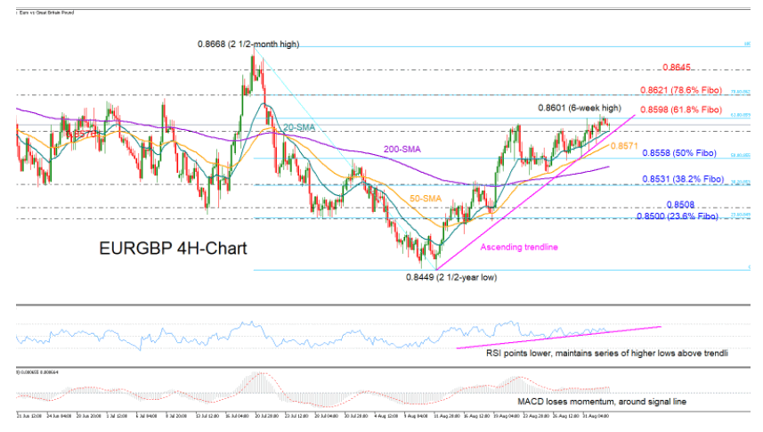 Instead, a slide below the supportive trendline drawn from the 2 ½ -year low of 0.8449 could create some anxiety, especially if the 50-period simple moving average (SMA) at 0.8571 proves fragile this time, letting selling forces to spiral towards the 50% Fibonacci of 0.8558. Moving lower from here, the 200-period SMA may attempt to prevent any declines towards the 38.2% Fibonacci of 0.8531.