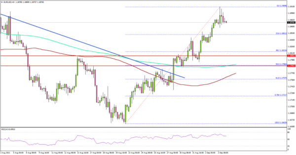 It even broke the 1.1850 resistance and spiked above 1.1900. A high was formed near 1.1909 and the pair is now consolidating gains.