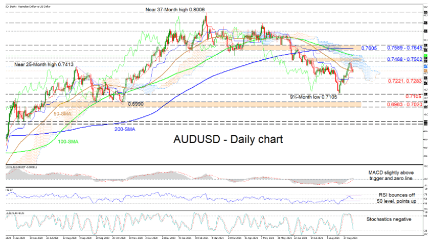 AUDUSD has pulled back beneath the Ichimoku cloud meeting the 50-day simple moving average (SMA) after a rally off a 9½-month trough, which formed at 0.7105. The longer-term 200-day SMA has yet to deliver a signal that negative forces are gaining an advantage. That said, the 50- and 100-day SMA’s prevailing bearish bearing remains intact for now, promoting sellers are at the wheel.