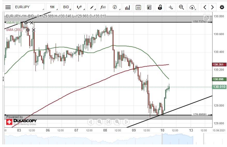 However, the 50– hour simple moving average at 130.12 could provide resistance for the EUR/JPY currency exchange rate within this session.