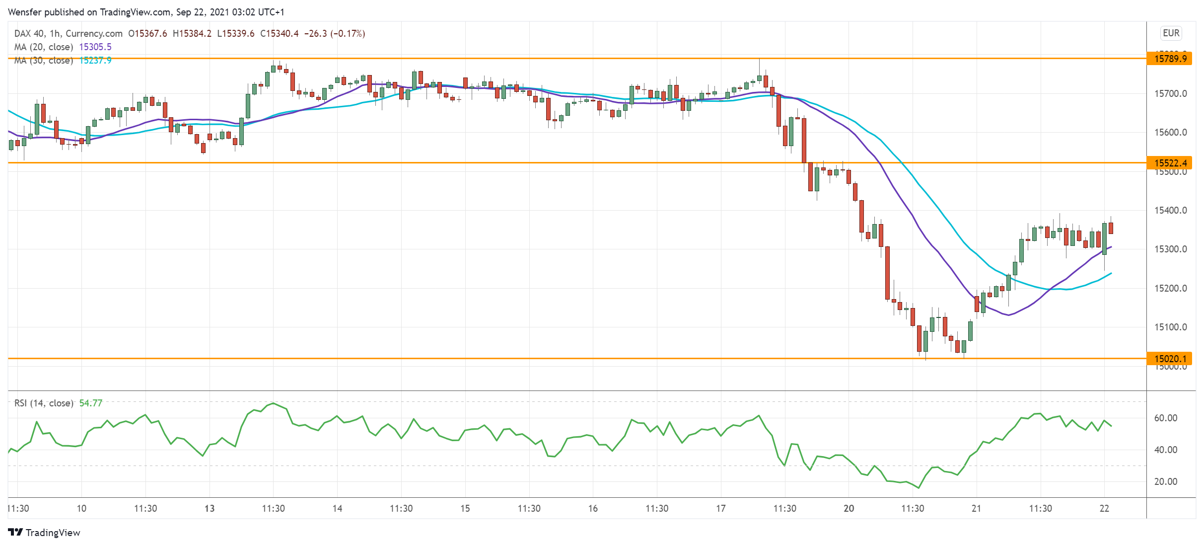 The Dax 40 whipsaws due to the risk of contagion from Chinese real estate developer Evergrande defaulting.