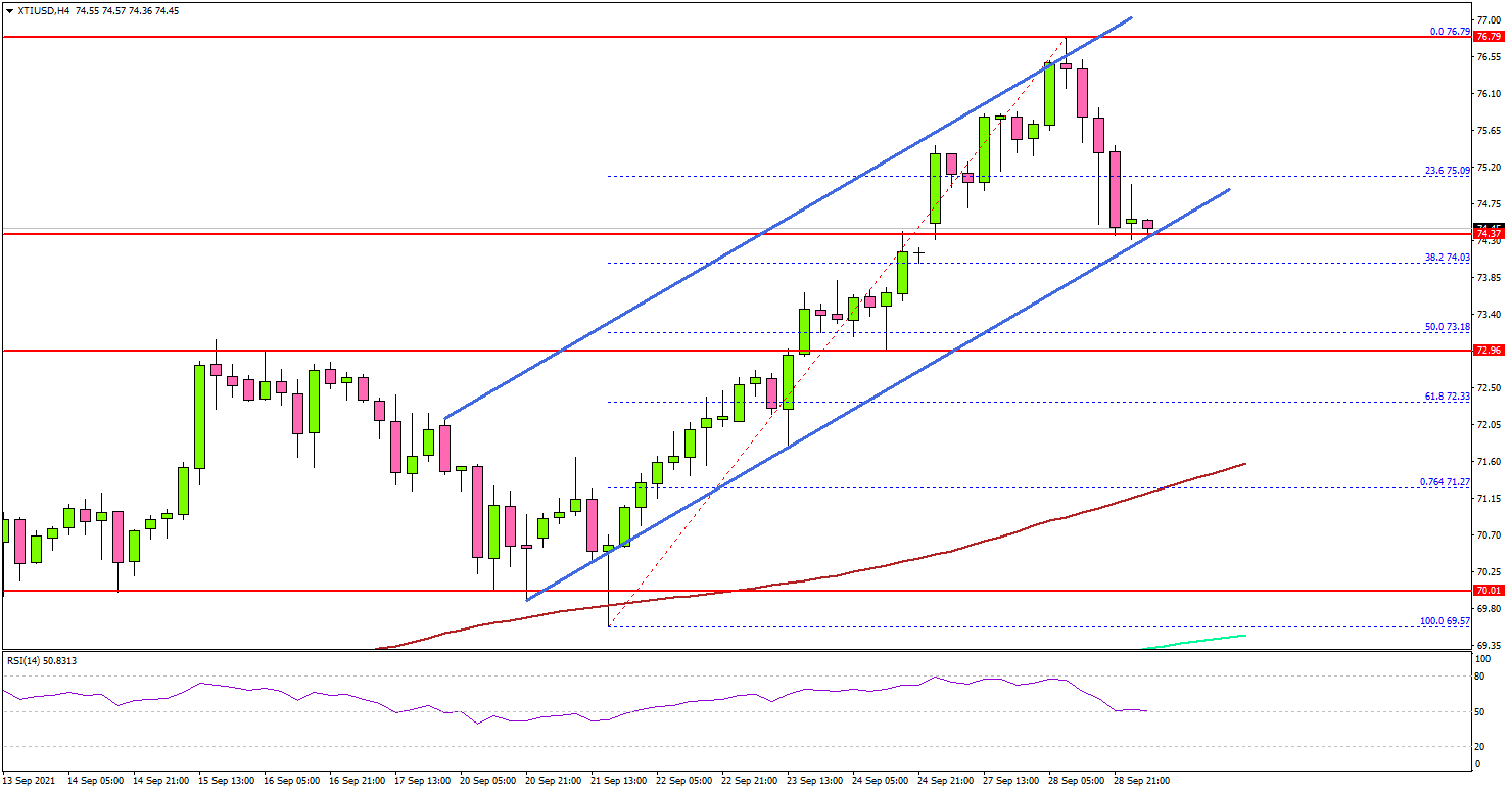 - A key rising channel is forming with support near $74.30 on the 4-hours chart of XTI/USD.
