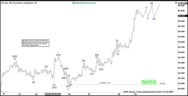 Short Term view in US Dollar Index (DXY) suggests the rally from Sept 3, 2021 low is unfolding as a 5 waves impulse Elliott Wave structure. Up from Sept 3, wave ((i)) ended at 92.8, dips in wave ((ii)) ended at 92.32. Index resumes higher in wave ((iii)) to 93.45, pullback in wave ((iv)) ended at 93. The Dollar Index then completed wave ((v)) at 93.52 which should also end wave 1 in higher degree. Pullback in wave 2 ended at 92.98 with internal subdivision as a zigzag. Down from wave 1, wave ((a)) ended at 93.14, wave ((b)) ended at 93.25, and wave ((c)) ended at 92.98.