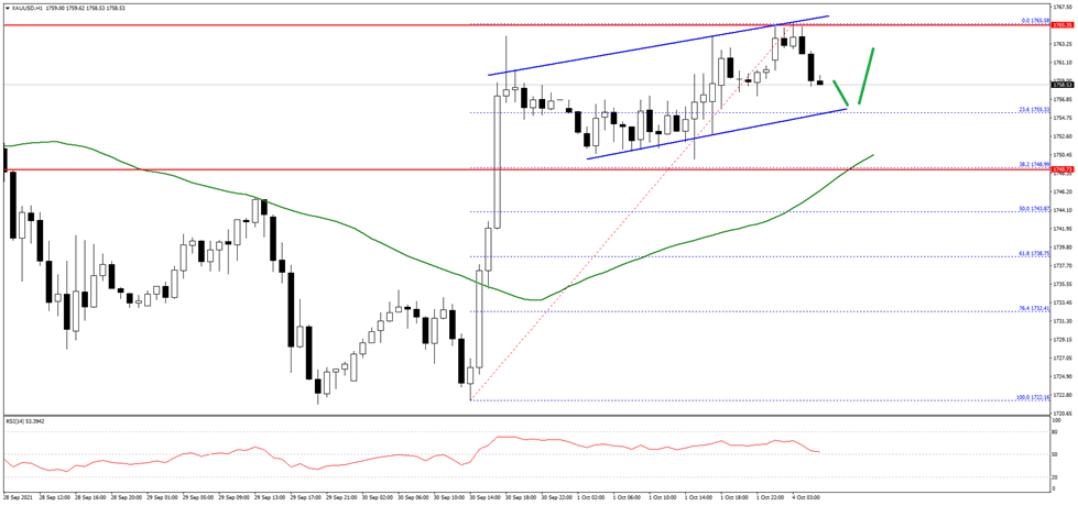 There was a break above the $1,750 level and the 50 hourly simple moving average. The price traded as high as $1,765 and it is now correcting lower. On the downside, there is a key rising channel forming with support near $1,755 on the hourly chart.