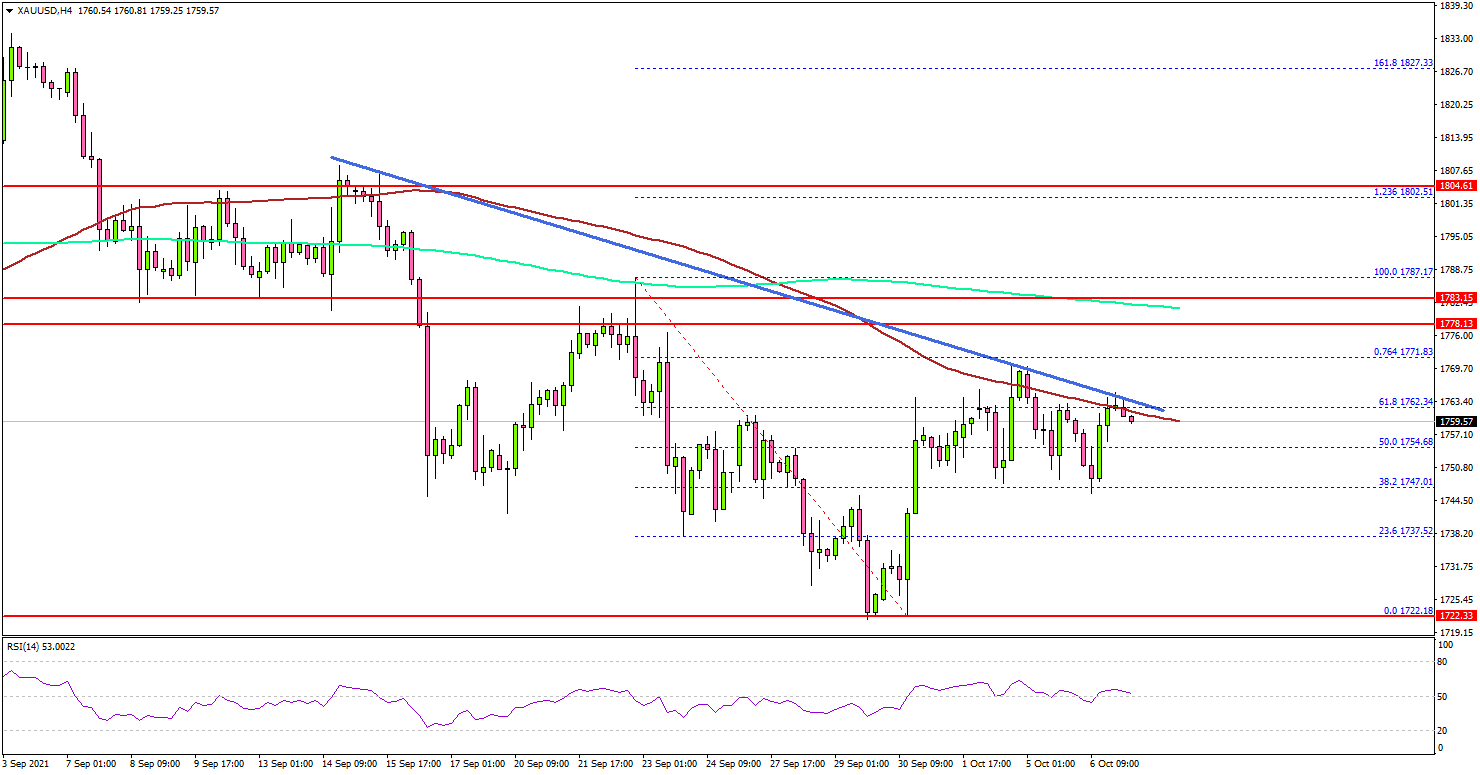 - A major bearish trend line is forming with resistance near $1,760 on the 4-hours chart.
