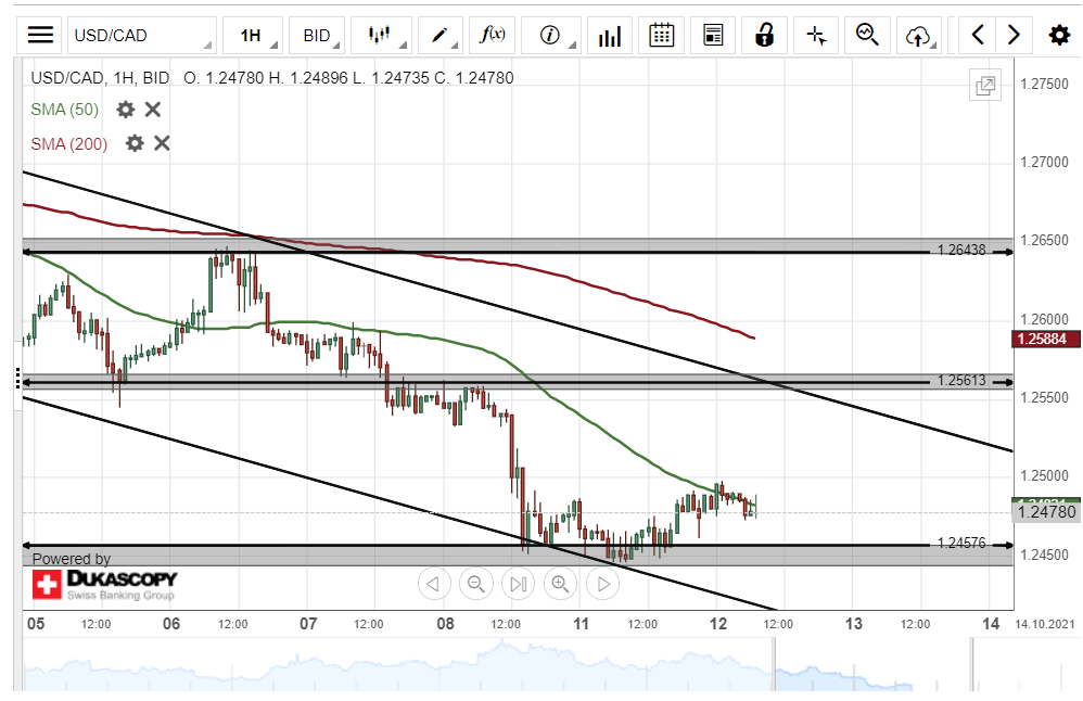 On Monday, the USD/CAD currency pair bounced off a support level at 1.2450. As a result, the US Dollar edged higher by 46 pips or 0.37% against the Canadian Dollar during Monday’s trading session.