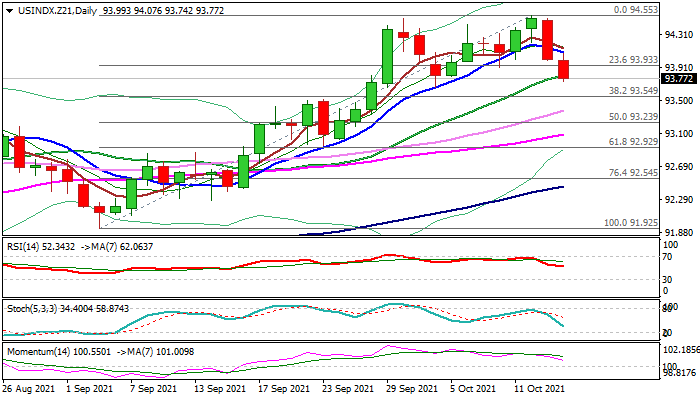 Thursday’s action broke below rising 20DMA (93.80) and eye pivotal Fibo support at 93.54 (38.2% of 91.92/94.55), violation of which would confirm reversal and risk drop towards 93.23 (50% retracement) and 93.08 (55DMA).