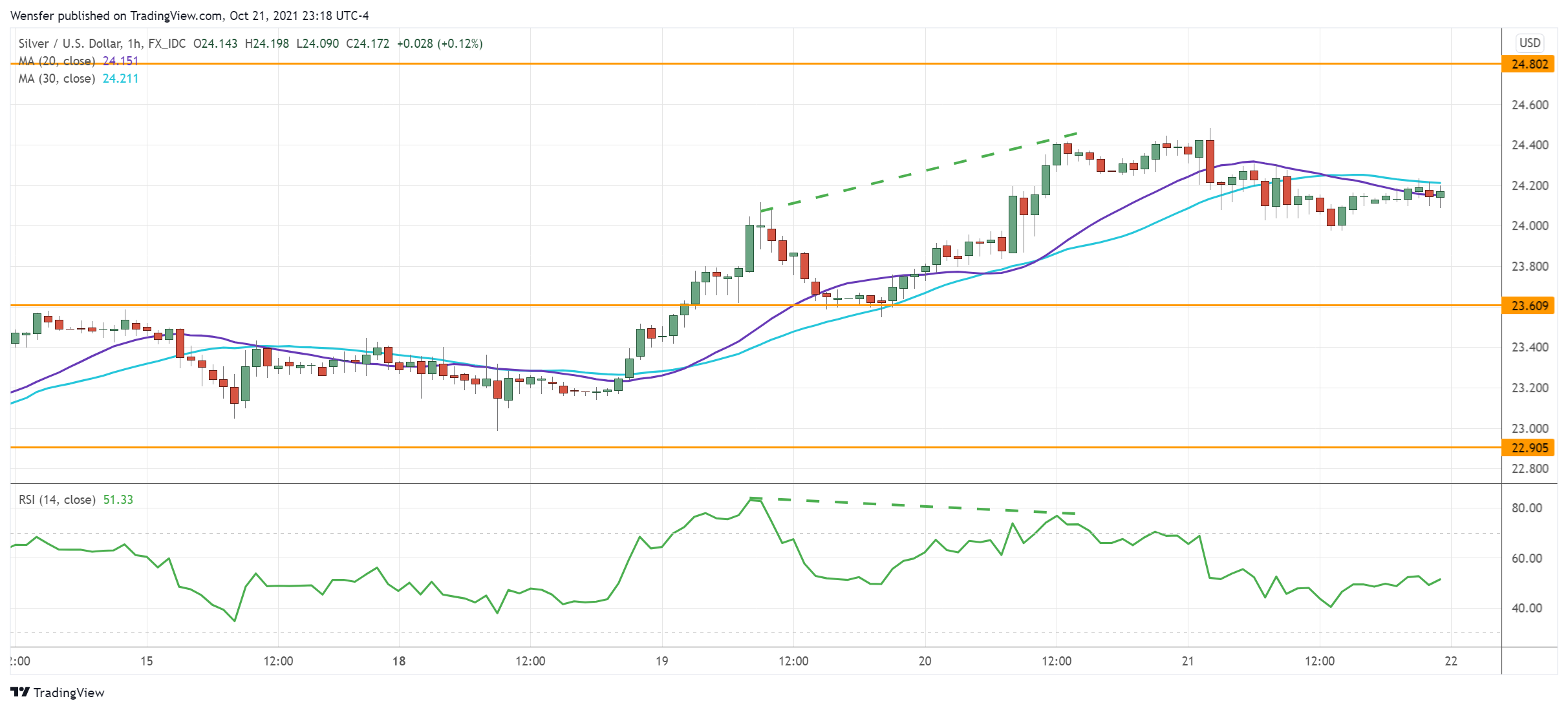 However, an overbought RSI coupled with a bearish divergence suggests possible exhaustion in the run-up. 23.60 would be the first level to watch for if the price pulls lower in search of support.