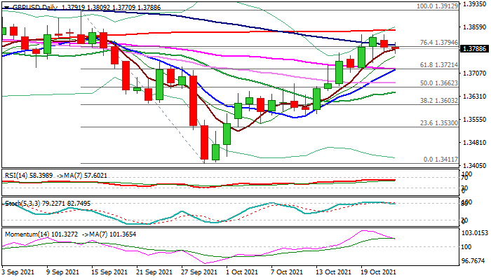 Return below broken 100DMA (1.3798) and Fibo 76.4% barrier (1.3794) adds to initial signal of stall and shift near-term focus lower.