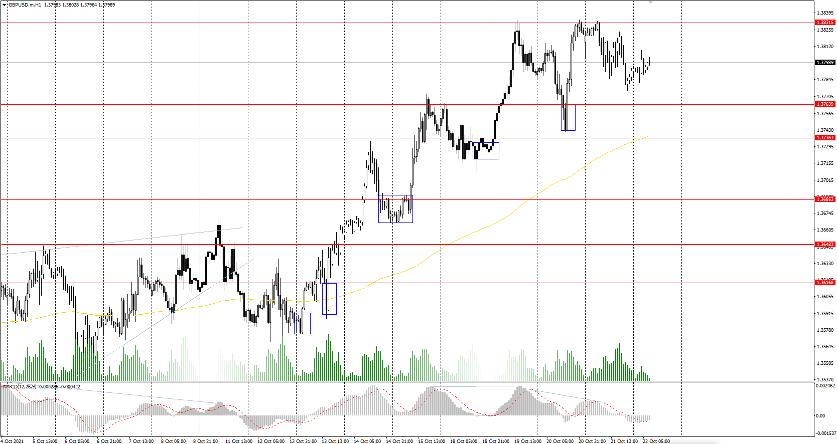 From the technical point of view, the EUR/USD on the hour timeframe is bullish. The MACD indicator became negative. Under such market conditions, traders should consider buying positions from the support levels near the moving average or from the buyer’s initiative areas. It is best to look for sell trades from the resistance levels of the higher timeframe.