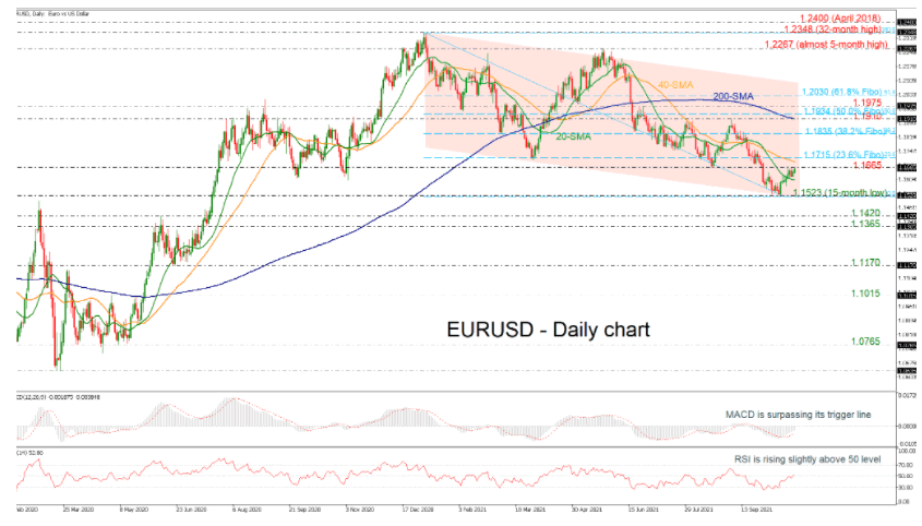 EURUSD has hardly gained ground above the 15-month low of 1.1523, although the recent weak bullish effort could see further extension above the 1.1665 strong resistance level. The RSI indicator is trying to improve above the neutral threshold of 50 and the MACD oscillator is moving above its trigger and zero lines.
