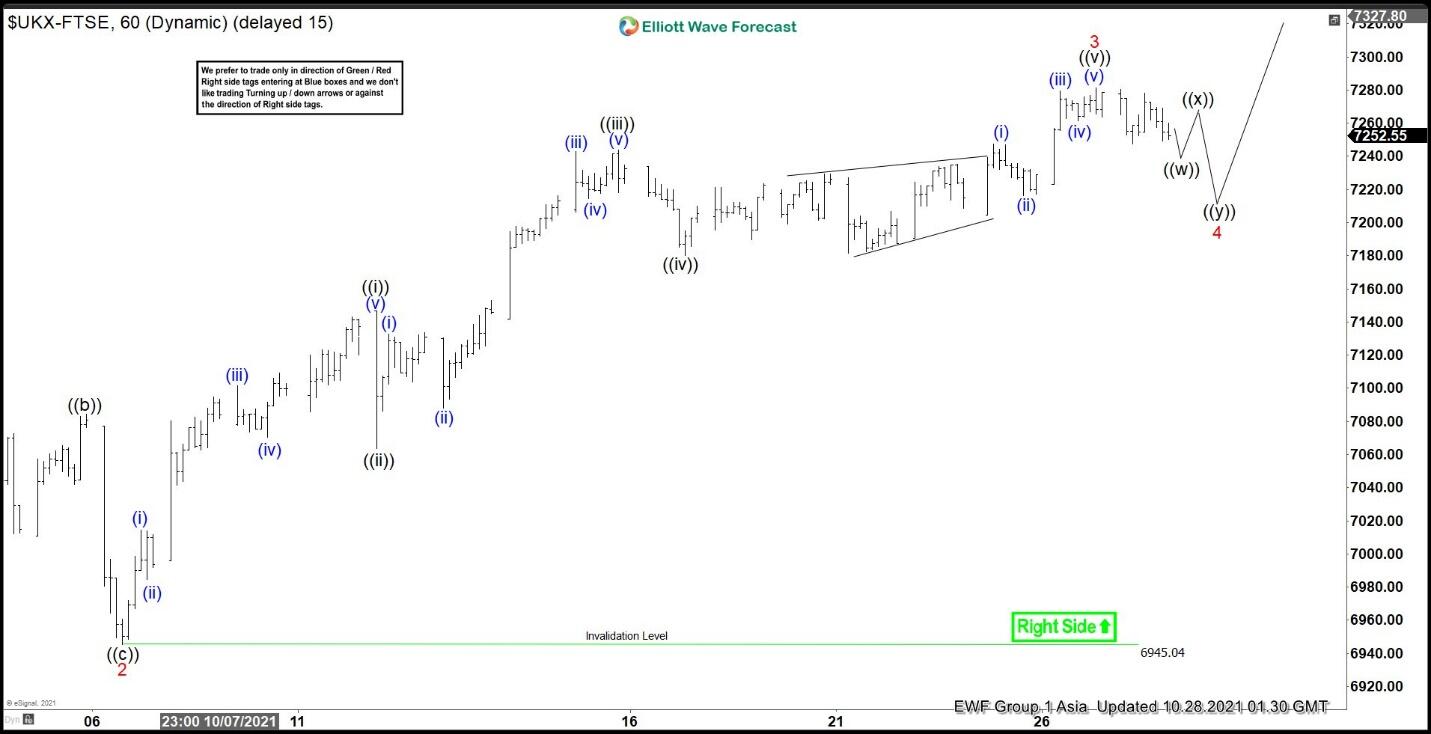 Financial Times Stock Exchange (FTSE) has continued higher following other major indices world wide. Short term Elliott Wave view suggests the rally from September 20, 2021 low is unfolding as a 5 waves impulse Elliott Wave structure. Up from September 20 low, wave 1 ended at 7159.61 and pullback in wave 2 ended at 6945.04. Index then resumes higher in wave 3 towards 7243.85. Internal subdivsiion of wave 3 is unfolding as an impulse in lesser degree.