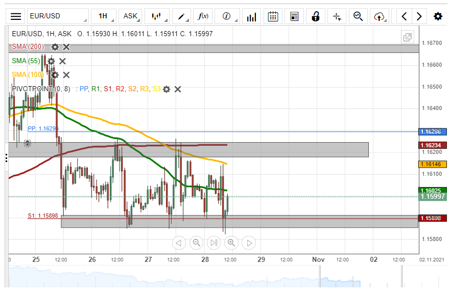Since the decline on October 25, the EUR/USD has continued to trade in range between the support of the 1.1585/1.1590 zone and the resistance of the 1.1618/1.1625 zone. Meanwhile, it has been spotted throughout the week that the hourly simple moving averages from time to time manage to impact the direction of the currency exchange rate.