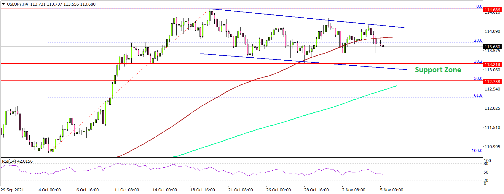 Looking at the 4-hours chart, the pair formed a high near 114.68 before it started a downside correction. There was a break below the 114.20 and 114.00 support levels.