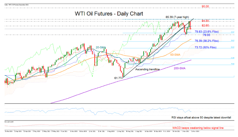 Should the bears gear up, the price could initially test the 79.83 – 79.00 region formed by the 23.6% Fibonacci of the 61.27 – 85.39 upleg and the limits emerged in early October and November. The 50-day simple moving average (SMA) at 77.33 may attempt to add some footing with the help of the 38.2% Fibonacci of 76.39 if the sell-off picks up steam, while lower, another notable decline is expected to take place, likely driving the price towards the 50% Fibonacci of 73.72.