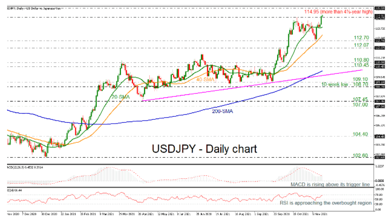 USDJPY is recording new highs slightly below the 115.00 psychological level, extending the bullish structure that started from the 112.70 support level.