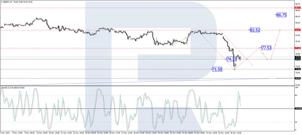 As we can see in the H1 chart, Brent s forming the first ascending structure and may soon reach 77.53. Later, the market may correct towards 74.33 and then resume trading upwards with the first target at 82.52. From the technical point of view, this idea is confirmed by the Stochastic Oscillator: after breaking 50 to the upside, its signal line is expected to test this level and then resume growing to reach 80.