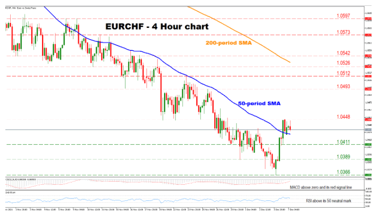 EURCHF is currently trading below its 200-period simple moving average (SMA), which together with the pair’s successive lower lows reflect an overall bearish outlook. However, the near-term sentiment appears to be cautiously positive as the price has recently crossed above its 50-period SMA, breaking a series of successive lower highs.