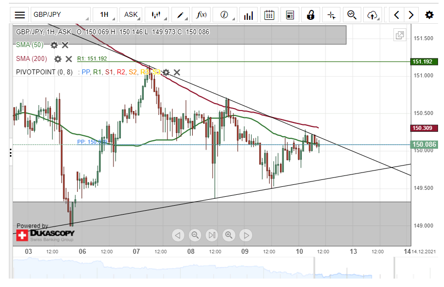 On Friday morning, the GBP/JPY pair passed the resistance of the 50-hour SMA and the weekly simple pivot point near 150.00. However, the surge stopped. After a review, it was discovered that the this week’s high and low levels can be connected to reveal a triangle pattern. Namely, the rate’s surge was stopped by the upper trend line of the triangle.