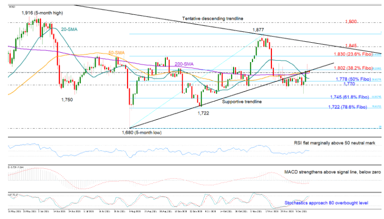 The 50- and 200-day simple moving averages (SMAs) and the 38.2% Fibonacci retracement of the 1,680 – 1,877 upleg are making any breakout around the 1,800 threshold more essential, but bullish signals are not really convincing yet, reflecting some cautiousness among traders instead. Particularly, the RSI has shifted to the sidelines after barely crossing above its 50 neutral mark, the MACD continues to gain ground within the negative area and above its red signal line, while the Stochastics are approaching their 80 overbought level.