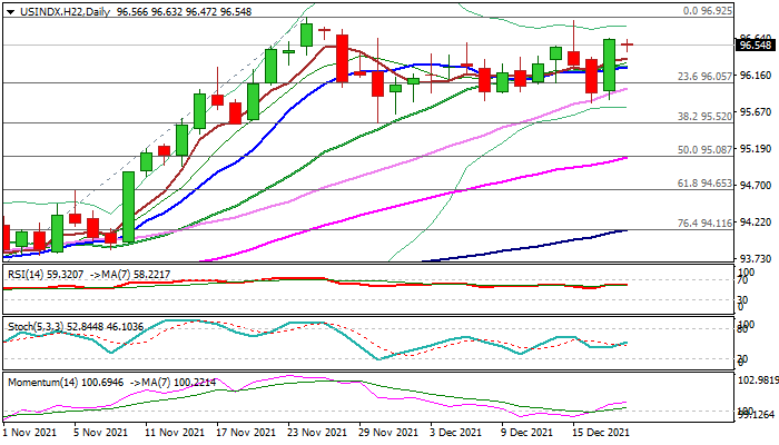 Near-term bias is expected to remain with bulls while the price stays above this level, underpinned by bullish signal from eventual weekly close above 96.47 (50% retracement of larger 103.80/89.15 fall), although the action continues to face strong headwinds from new 2021 high (96.92, posted on Nov 24).
