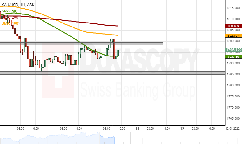 At mid-day on Monday, the price for gold broke the resistance of the 1,800.00 mark and shortly traded above this level. However, the surge was stopped and reversed by the 100-hour simple moving average at 1,802.65.