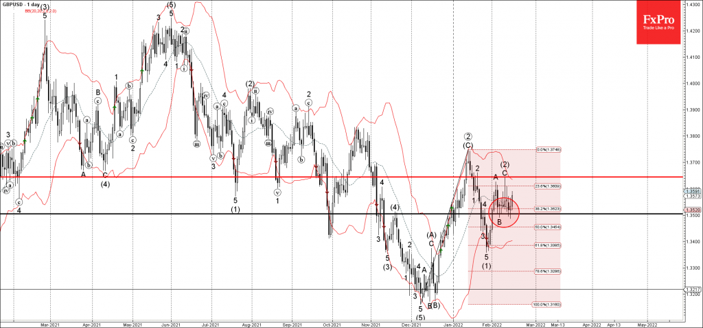 GBPUSD can be expected to rise further toward the next key resistance level 1.3645 (top of the previous waves 2 and (2)).