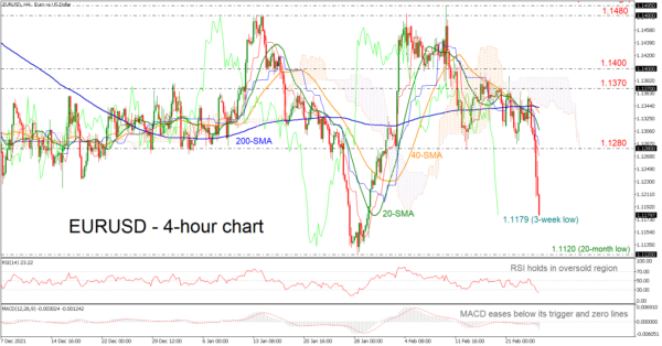 EURUSD is tumbling below the 1.1200 psychological level, reaching a new three-week low. The price pulled back off the simple moving averages (SMAs) creating a strong selling interest. The RSI indicator is reaching the oversold territory, while the MACD is strengthening its negative momentum below its trigger and zero lines.